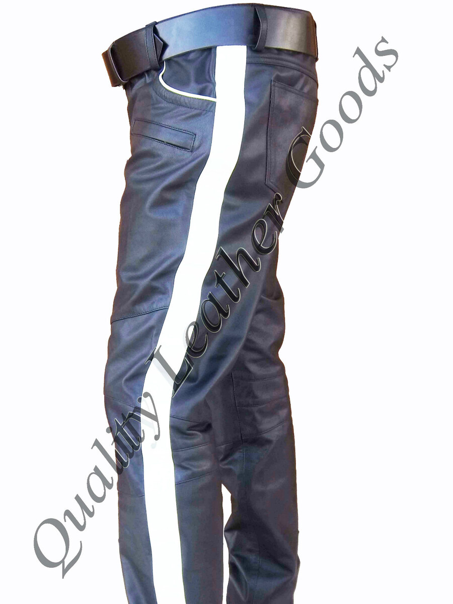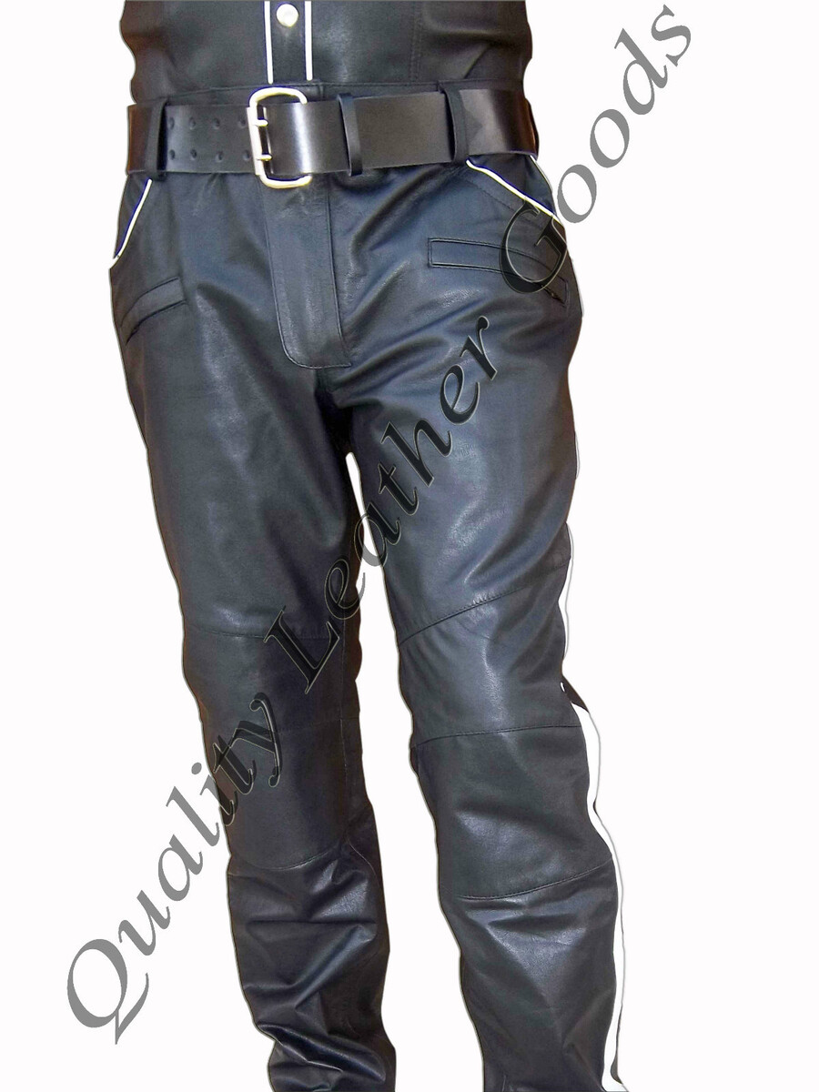 MENS LEATHER LEDER CUIR PANTS JEANS TROUSER WITH COLOURED PIPING & SIDE STRIP
