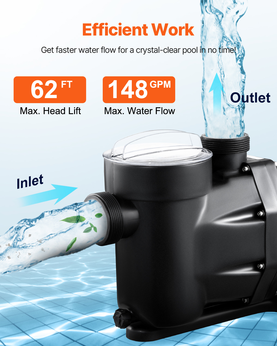 Experience Unmatched Versatility: This swimming pool pump is ideal for above-ground pools, hot tubs, spas, wellness centers, and irrigation systems. It provides clean, clear water for your swimming enjoyment all summer long. Note: Not for use with pool storage systems