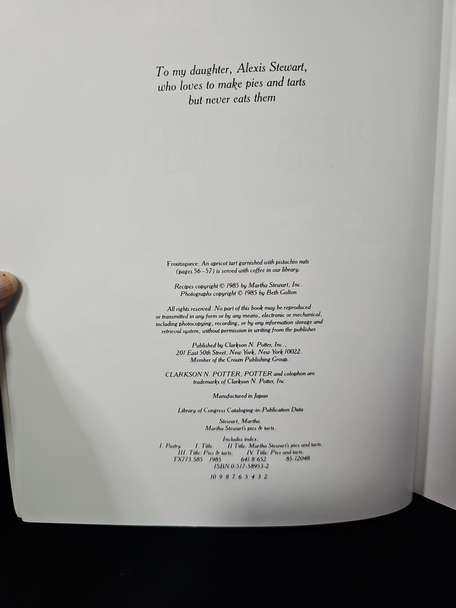 UP FOR SALE: Martha Stewart?s Pies Tarts (1985). Hardcover cookbook featuring classic and creative pie and tart recipes with step-by-step instructions and full-color photography. Includes savory and sweet recipes, pastry tips, and decorating ideas. Pre-owned with light cover wear, clean pages, and intact binding ? perfect for bakers, collectors, and Martha Stewart fans.