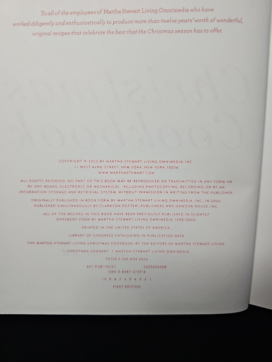 UP FOR SALE: Martha Stewart Living Christmas Cookbook (1st Edition, 2003). Hardcover collection of favorite holiday recipes?from festive cocktails and hors d?oeuvres to show-stopping desserts?illustrated with gorgeous color photography. First edition hardcover in very good condition (please describe any wear, writing, or notes inside). A must-have for collectors, decorators, and readers who love seasonal inspiration
