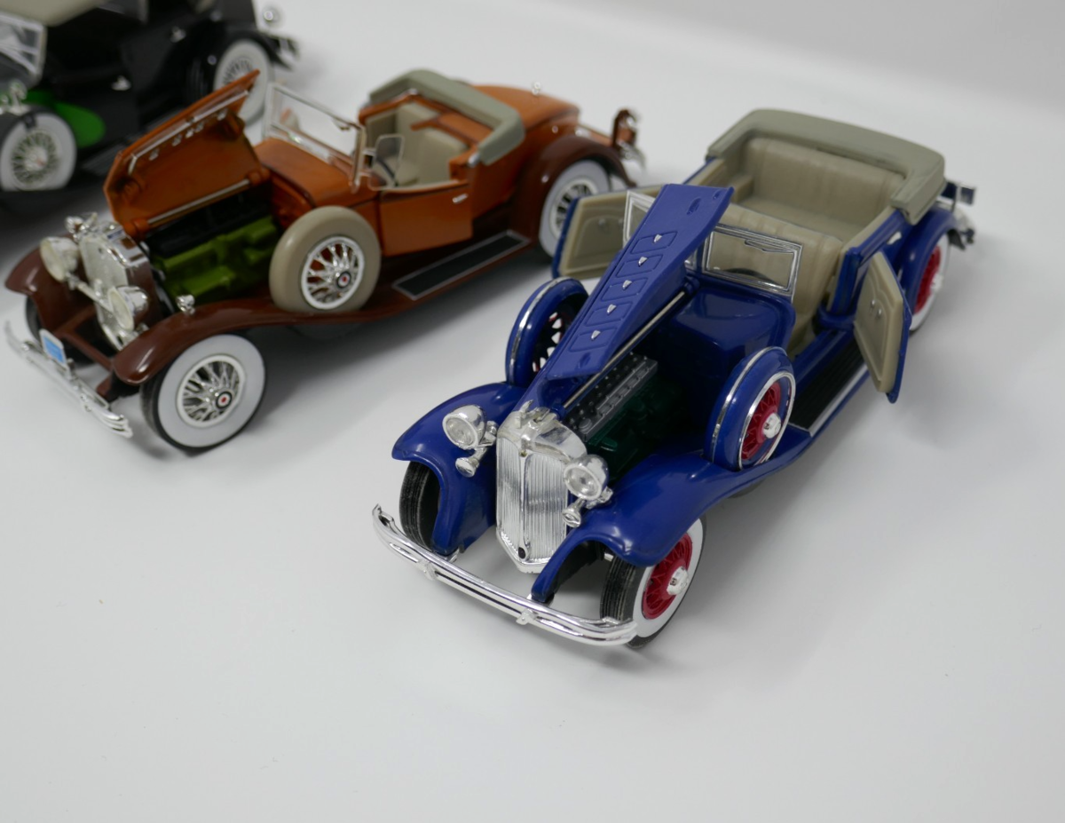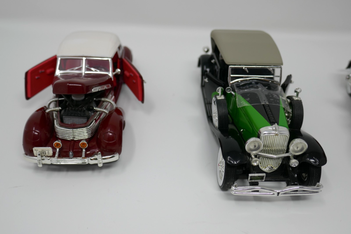 The National Motor Museum Mint Antique Car Lot features a collection of diecast cars in 1:32 scale, including iconic models such as the 1934 Duesenberg, 1937 Cord 812 Supercharged, 1930 Packard, and 1932 Chrysler Lebaron. These were only put on display but the Lebaron has a few scuffs on the front and small mark on one of the doors. Each car represents a piece of automotive history from the 1930s, making it a unique and valuable addition to any toy or diecast vehicle collection.