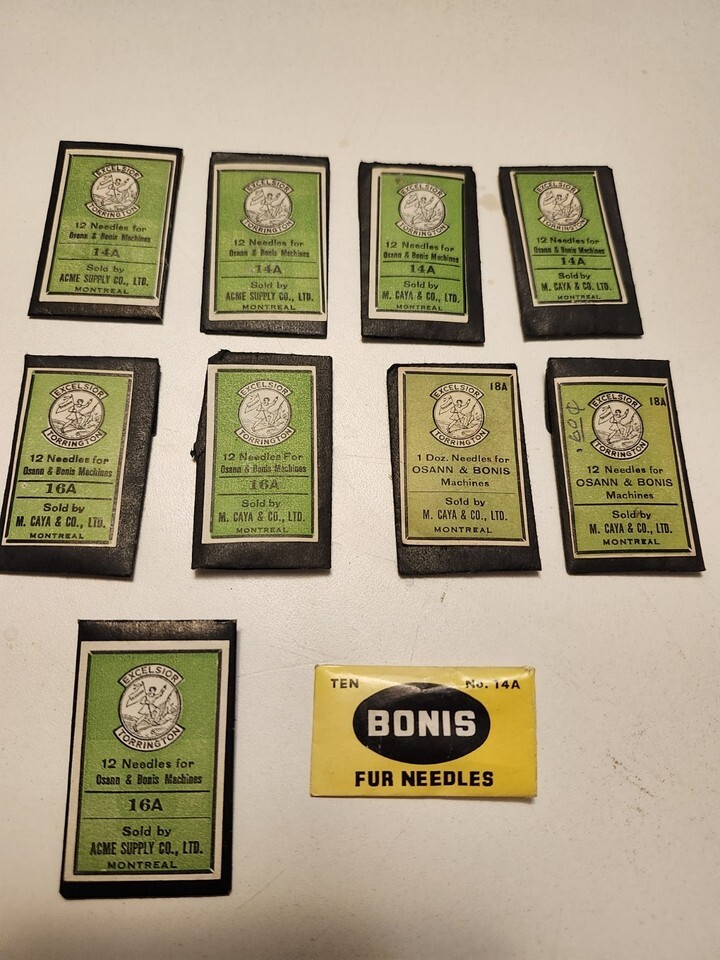 For sale is this Lot of Vintage Excelsior Torrington Fur Sewing Machine Needles - 10 packages. These needles come in packages, some have been open. I have NOT counted that each and every needle is in there but I doubt there are too many missing. Sold AS IS. Should be about 100 needles in there.
