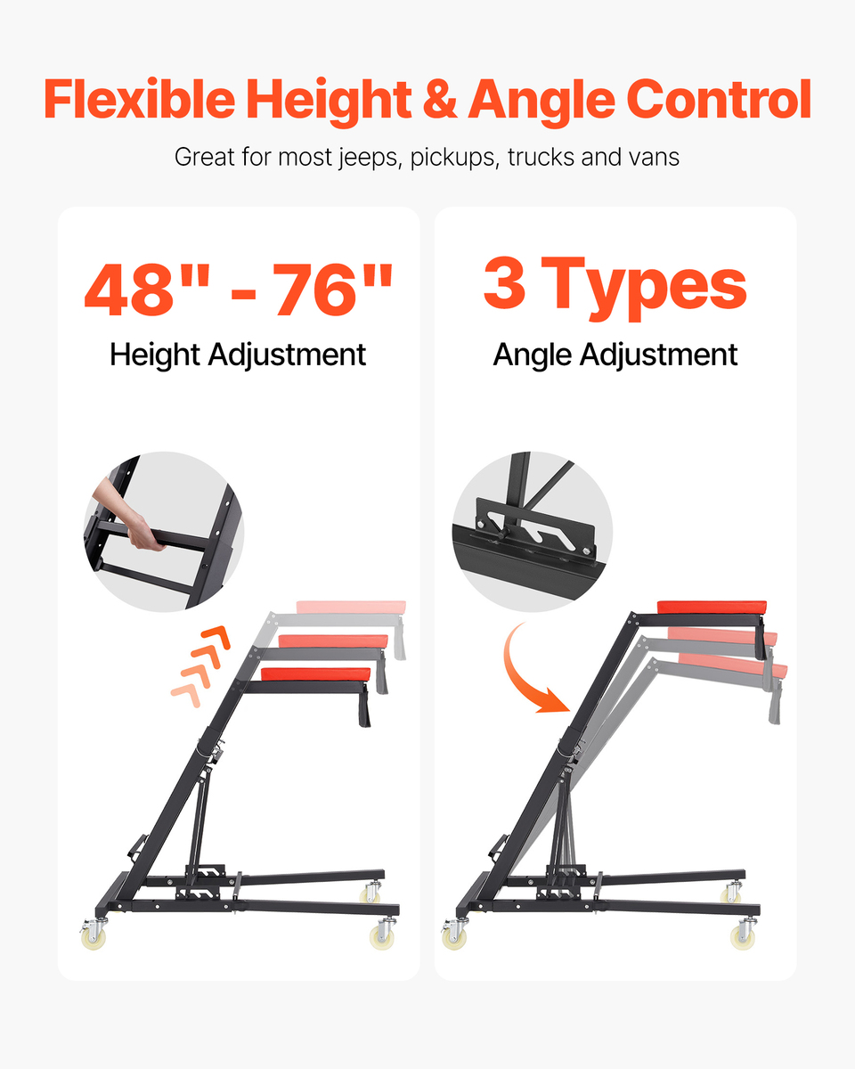 Flexible Height Adjustments: With a multi-stage height adjustment ranging from 48 to 76 inches (1219-1930 mm) and 3-angle options, our automotive topside creeper allows you to work comfortably without straining your body or overstretching your arms. Perfect for engine bay repairs on vehicles like jeeps, trucks, pickups, and more.
