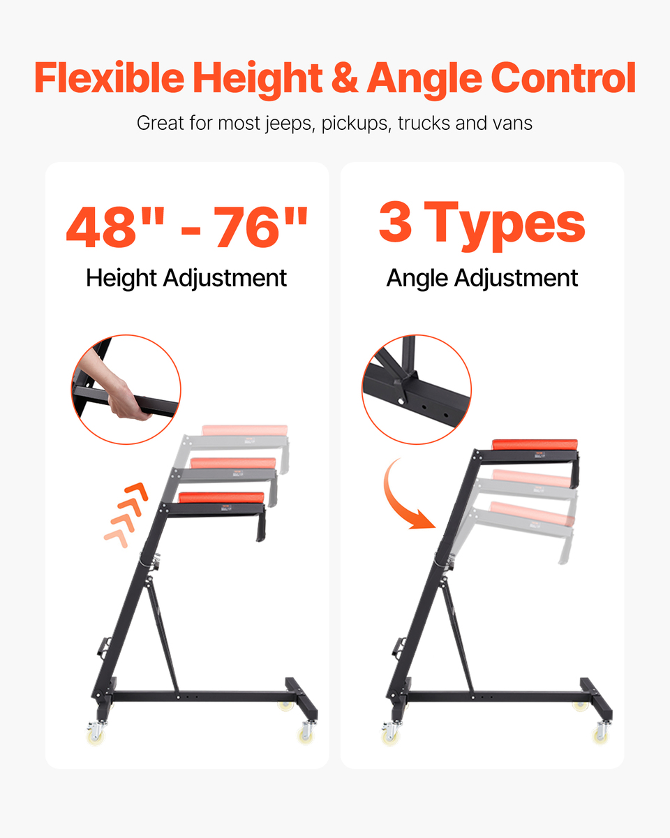 Flexible Height Adjustments: With a multi-stage height adjustment ranging from 49.6-75.6 inches (1260-1920 mm) and 3-angle options, our automotive topside creeper allows you to work comfortably without straining your body or overstretching your arms. Perfect for engine bay repairs on vehicles like jeeps, trucks, pickups, and more.