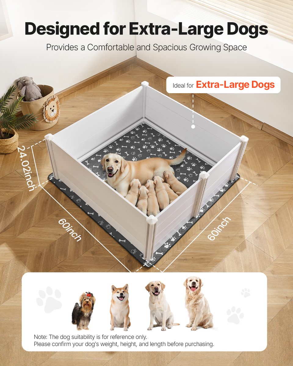 Whelping Box for Extra-Large Dogs: Sized at 60x60x24 inch / 1520x1520x610 mm, this dog whelping box offers a spacious, comfortable area for extra-large dogs, giving your dog plenty of room to move and grow. Please CONFIRM your dog’s weight, height, and length before purchase