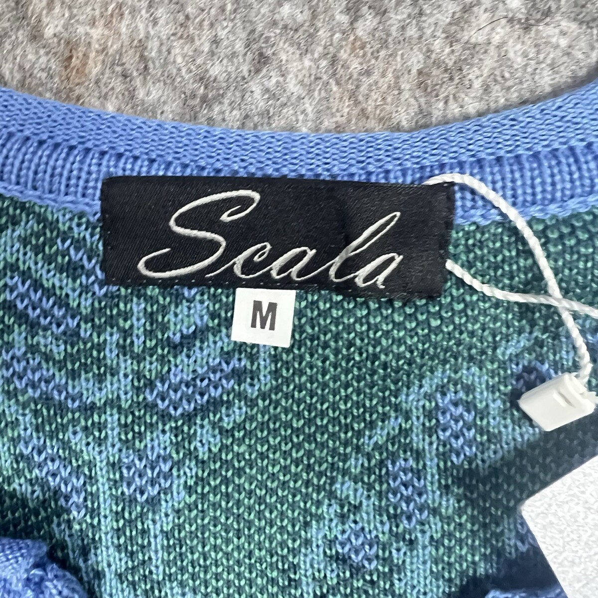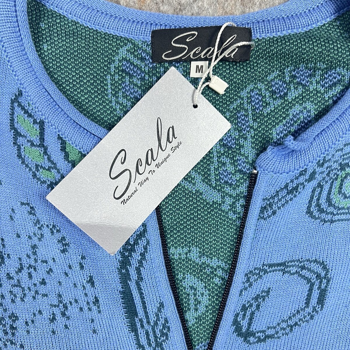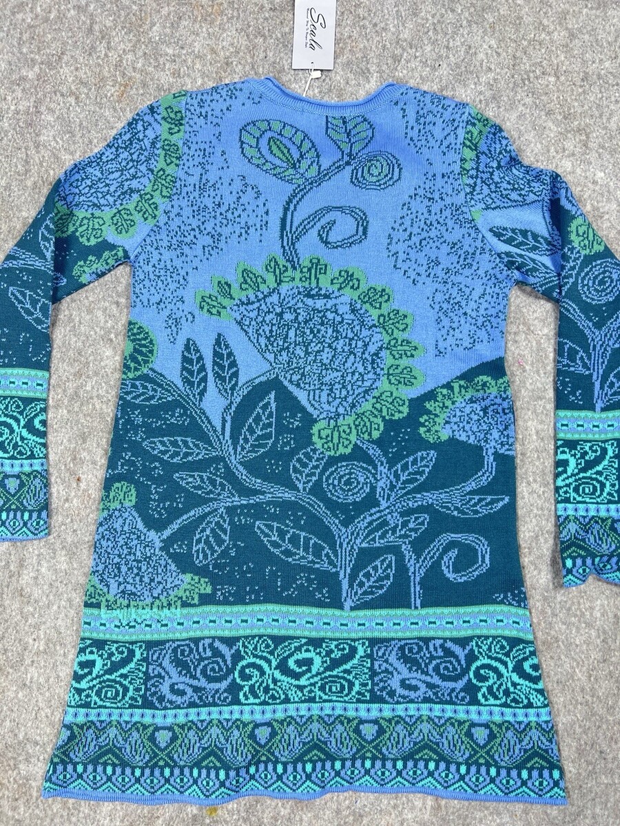 Scala Blue Multi Floral Knit Zip Coat Jacket Size M Long Sweater Coat Made in Poland
