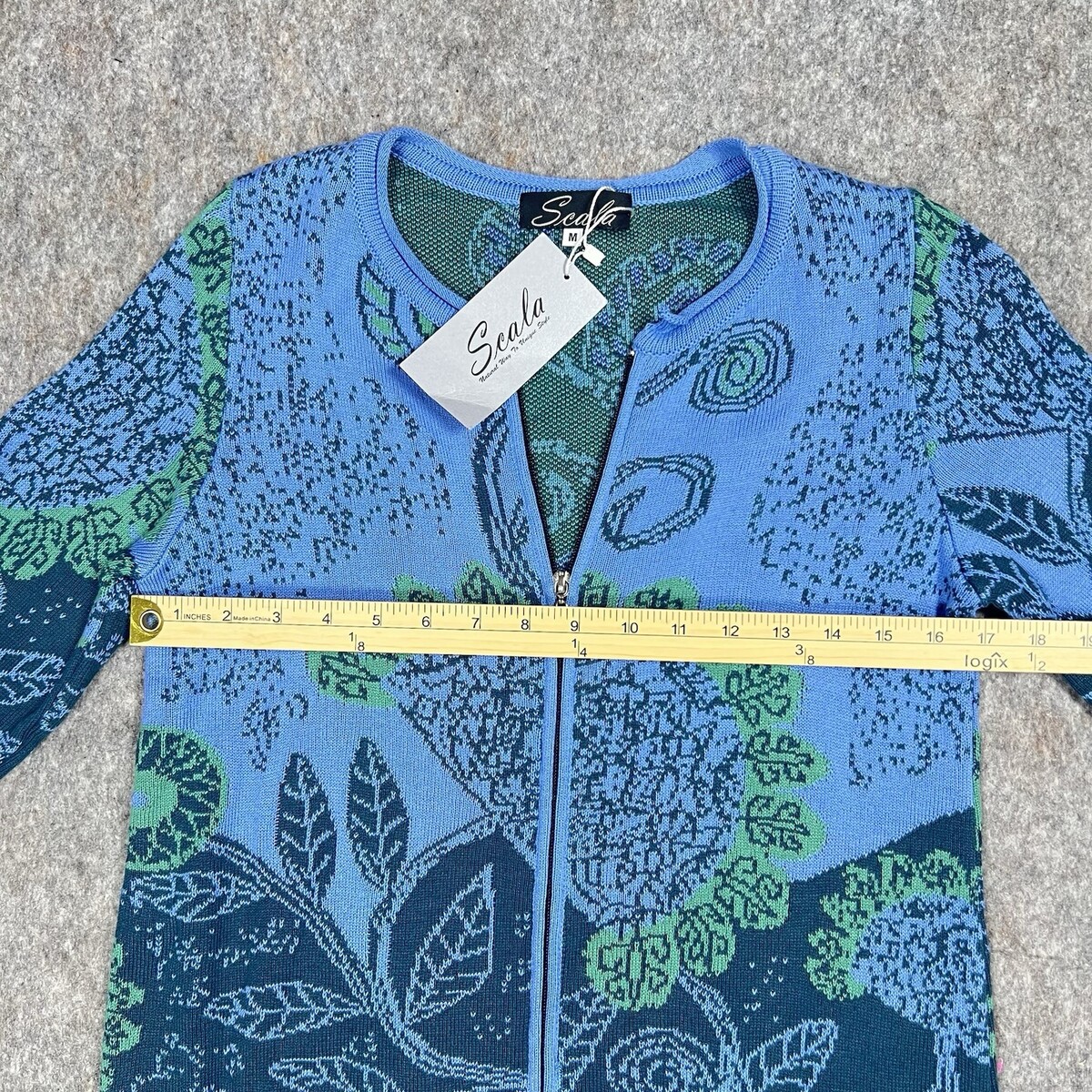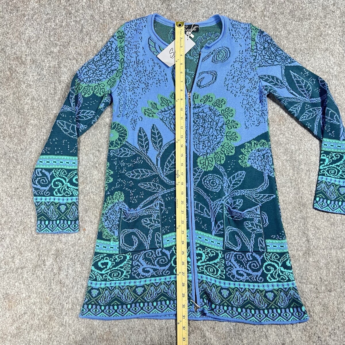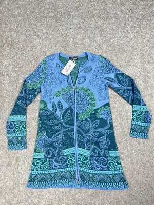 Scala Blue Multi Floral Knit Zip Coat Jacket Size M Long Sweater Coat New