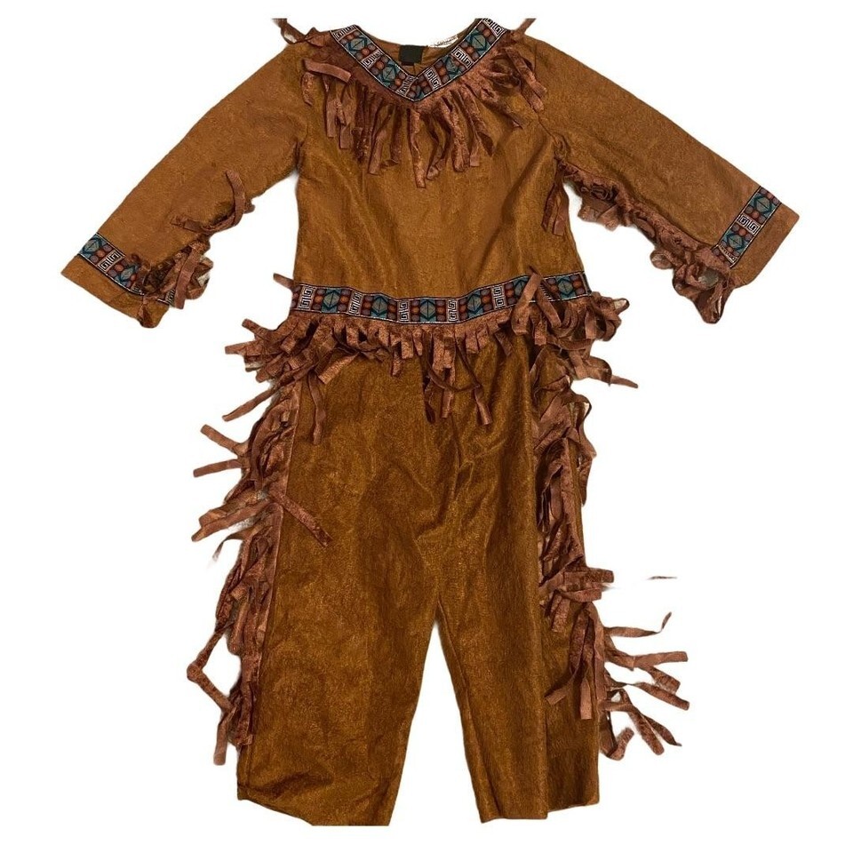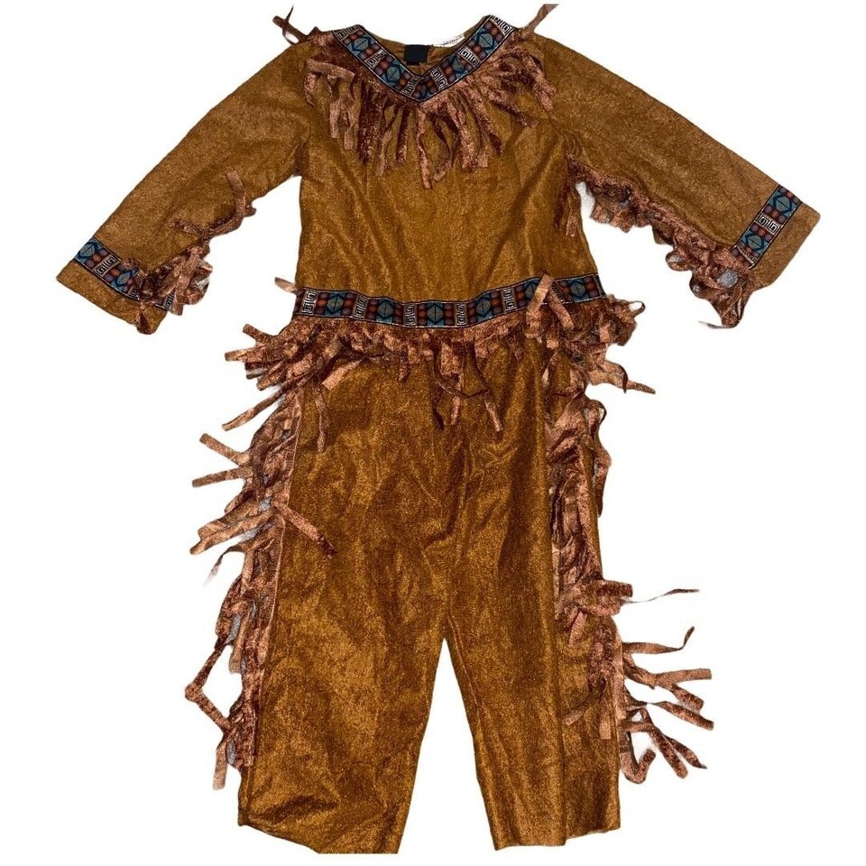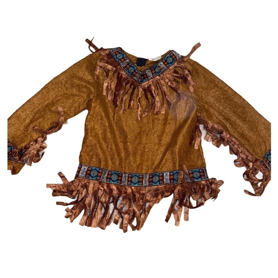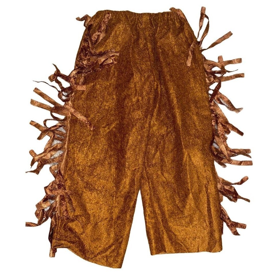 Perfect for imaginative play, this brown faux suede top and pants set features playful fringe detailing. Designed for ages 4-6, the outfit offers a comfortable fit and authentic look for dress-up fun.