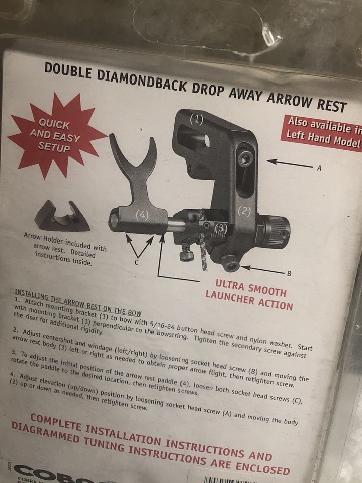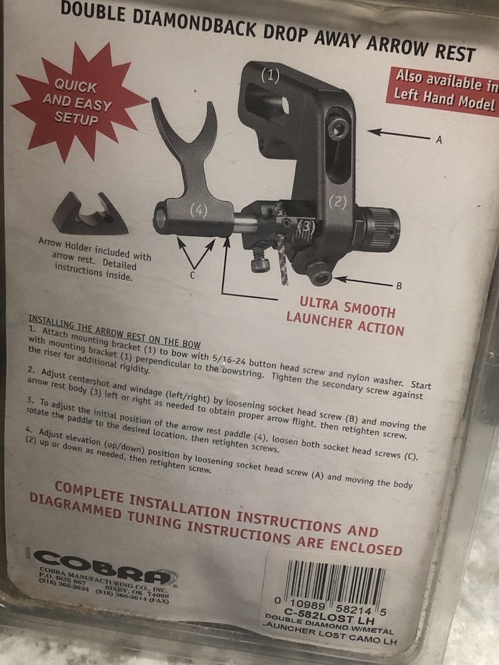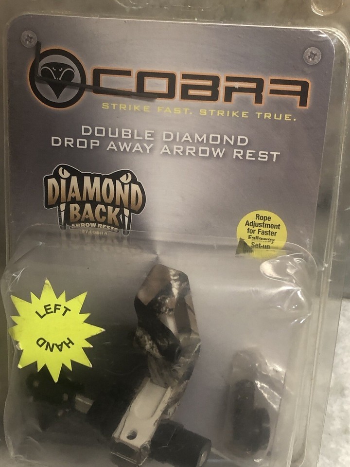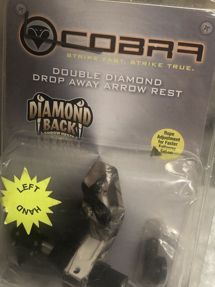 Cobra-Double Diamond Drop Away Arrow Rest-L Hand. ShipN24Hours. Item is new and Unused in a pushed up box. See photos attached for exact package condition.