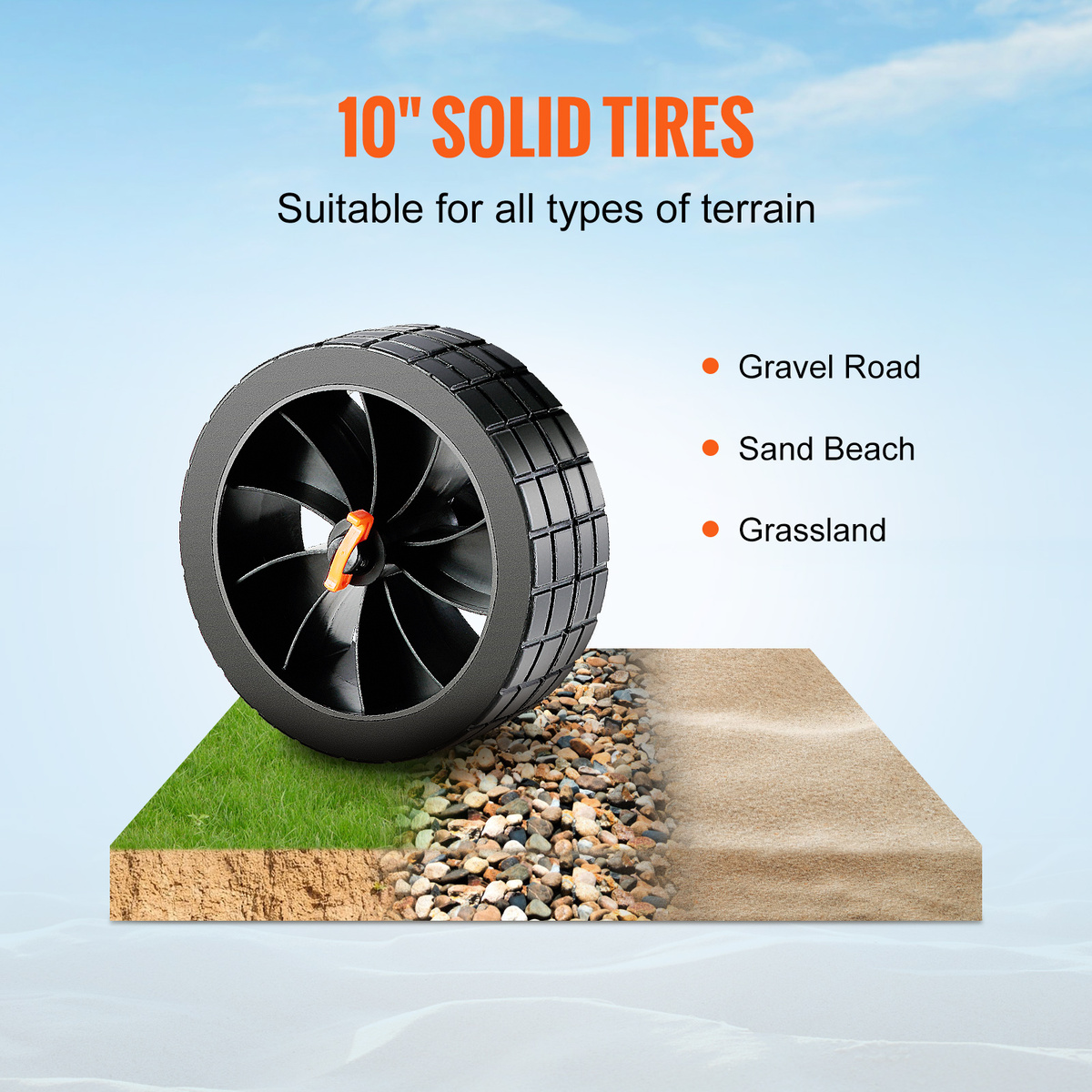 All-Terrain Solid Wheel: Our kayak cart is equipped with 10'' solid tires, which do not need inflation or pressure checks. The large-sized wheels can better absorb shock and pass through obstacle sections, making the cart suitable for all terrain, including grasslands, sand beaches, and gravel roads.