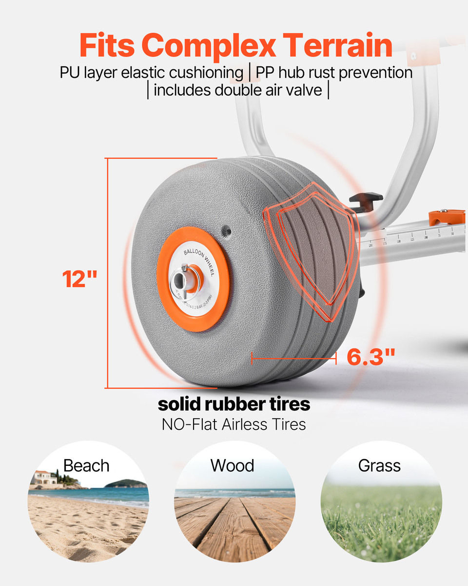 Smooth Ride: Equipped with 12-inch inflatable PU wheels and 6.3-inch wide tires, this kayak roller cart easily glides over sand, boardwalk docks, and grass. Also, comes with dual air nozzles for easy use