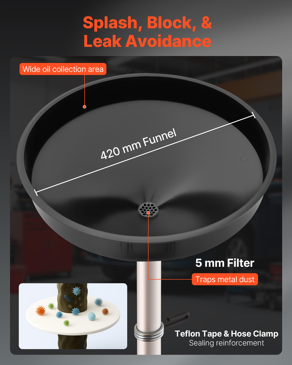 Leak-proof Design: Our oil drain container includes a 16.5-inch wide spill-proof funnel, improving oil recovery. Comes with extra sealing tape and clamps for additional leak protection, avoiding overflow and spills