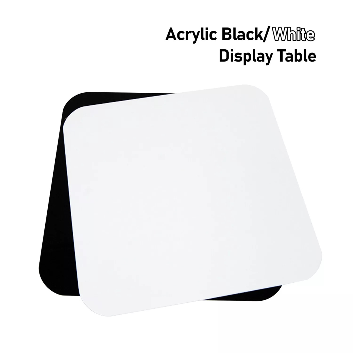 ?White Black Reflective Surface?Crafted from premium imported recyclable acrylic, this high-quality double-sided reflective display table is perfect for capturing professional photos of small items. Ideal for showcasing jewelry, cosmetics, consumer electronics, and delicate glass products with stunning clarity and elegance.