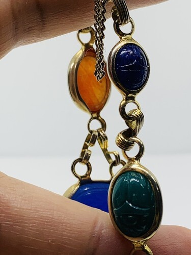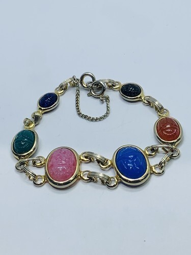 Vintage Multicolor Glass Cabochons Carved Scarab Bracelet w Safety Chain 7.5”
