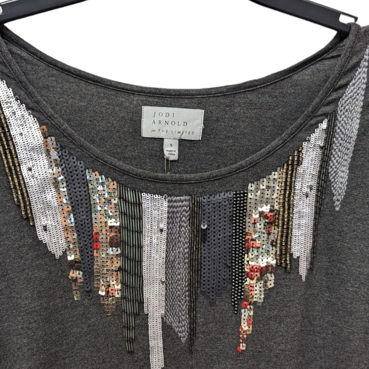 Embellishment: Features gold, silver, and black sequin detailing on the chest.