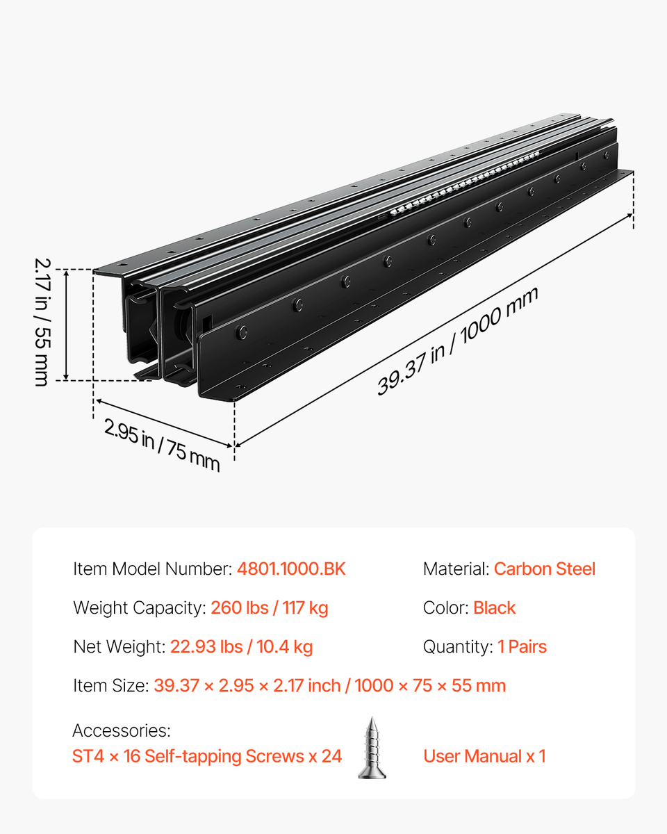 VEVOR Undermount Drawer Slides, 39.37 inch, Full Extension Ball Bearing, Black
