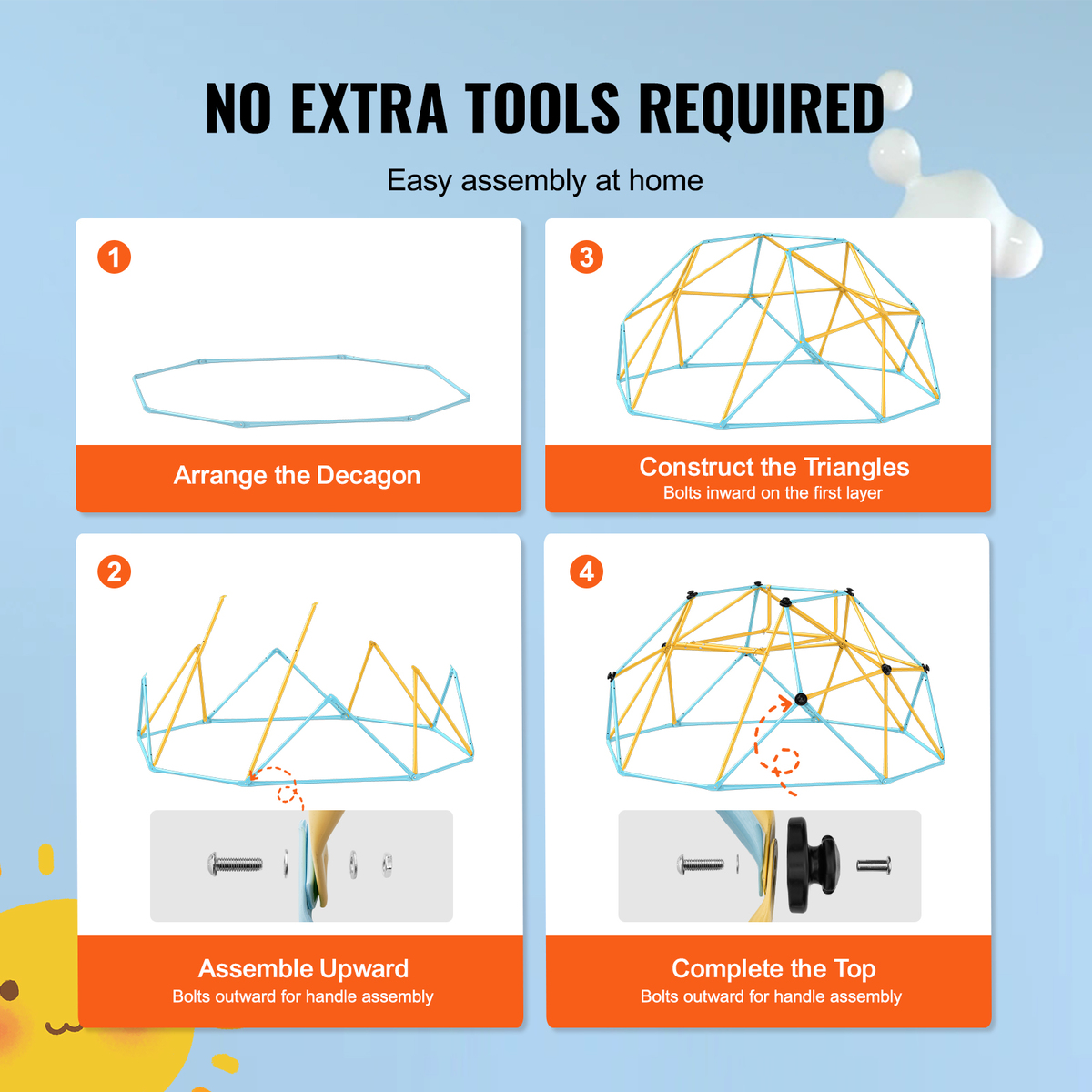 Easy Setup: Everything you need is included, from installation tools to detailed manuals and video guides. Our clear instructions will effortlessly guide you through assembly, allowing you to quickly create a fun playground for your children with our kids climbing dome.