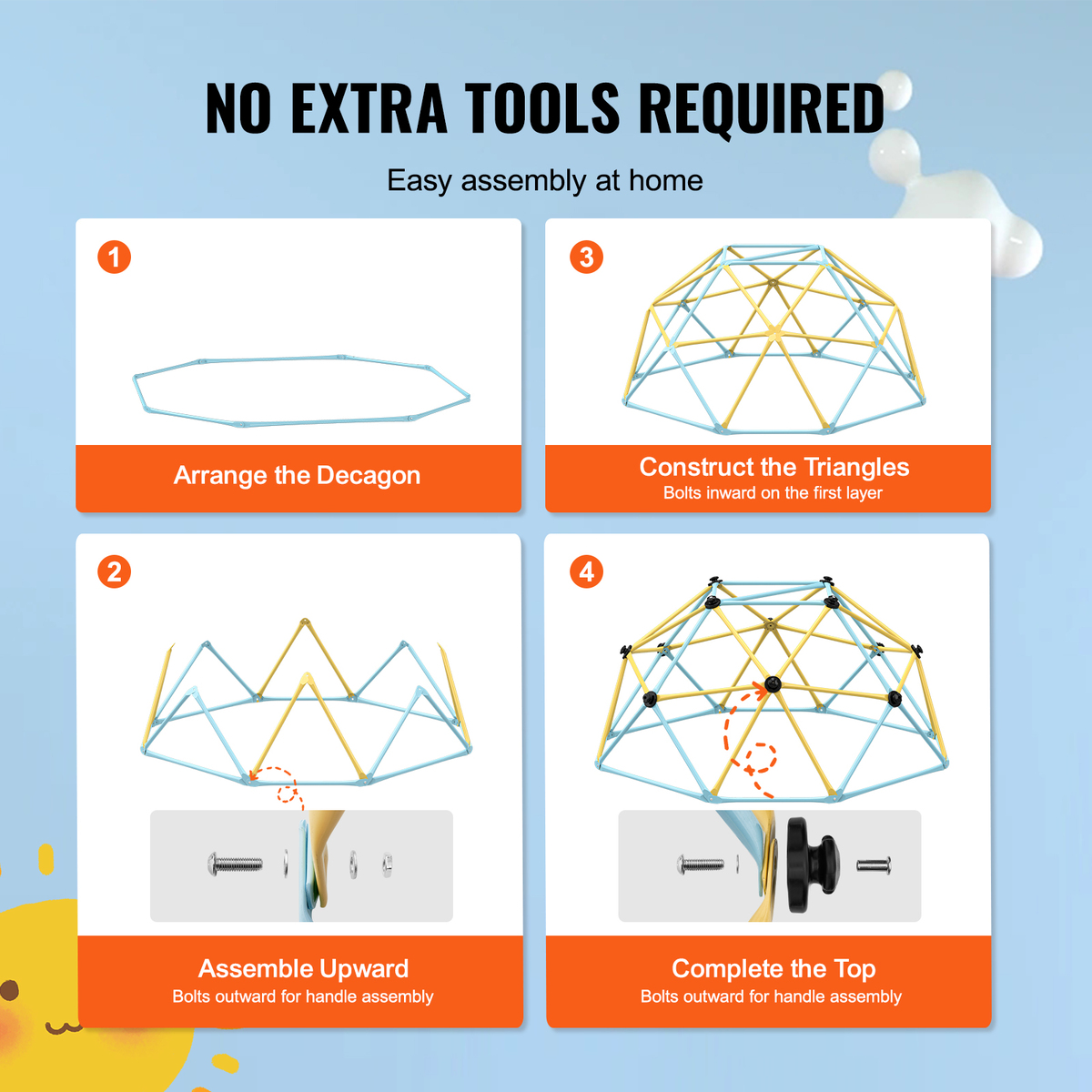 Easy Setup: Everything you need is included, from installation tools to detailed manuals and video guides. Our clear instructions will effortlessly guide you through assembly, allowing you to quickly create a fun playground for your children with our kids climbing dome.