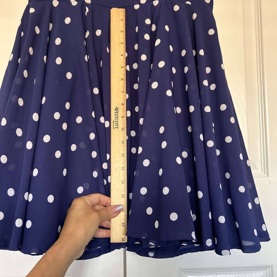 This is a Maison Jules dress in size M, featuring a navy blue color with white polka dots. It has a high neck, sleeveless design, and a fit flare style, perfect for summer and spring. The dress has a zip closure and falls at a midi length.