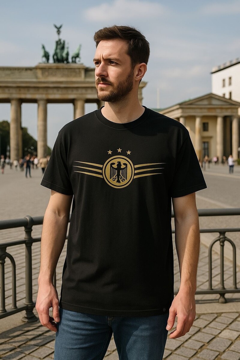 A classic MoonWorks tee featuring the German eagle emblem in metallic gold across the chest. Designed and printed in Germany. Soft cotton feel with a relaxed fit.