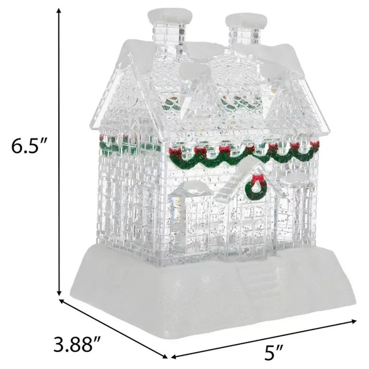 Brighten your console table display with this Holiday House Light Up Snow Globe! This water globe is designed to look like a clear house that is decorated with holiday accents. It sits on a sparkly snow base that matches its snowy embellishments. Turn the piece on to watch it light up and swirl sparkly pieces of glitter around and around!