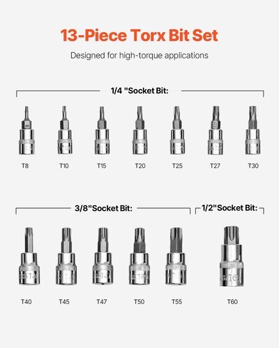 13-Piece Set: This torx socket set includes T8, T10, T15, T20, T25, T27, and T30 socket bits with a 1/4" drive; T40, T45, T47, T50, and T55 socket bits with a 3/8" drive; plus a T60 socket bit for a 1/2" drive-covering all your Torx fastener needs.