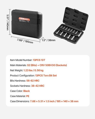 Torx Bit Socket Set 13-Piece Star T8 - T60 Set S2 Alloy Steel and Cr-V Steel