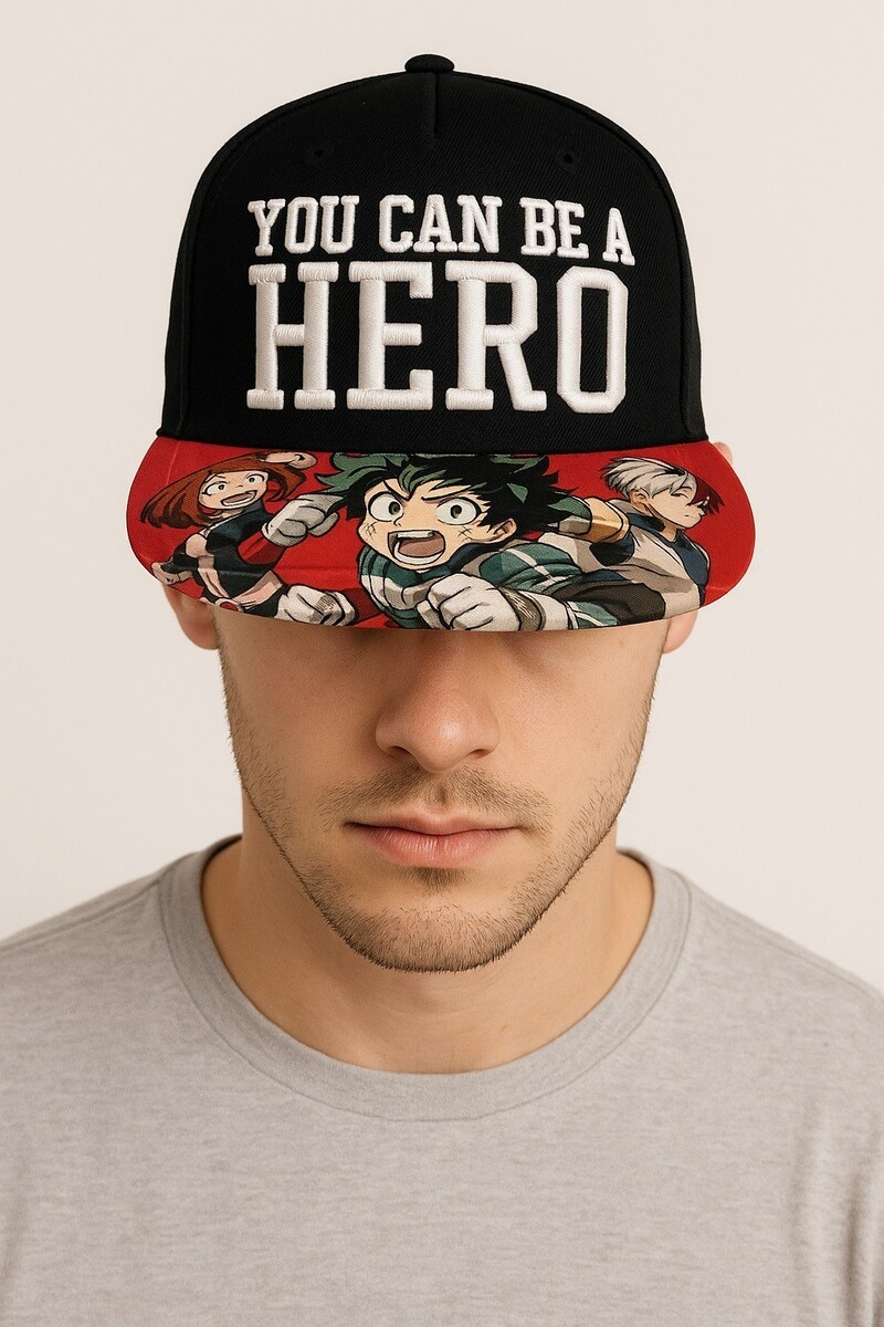 Officially licensed My Hero Academia snapback hat featuring raised embroidered ?You Can Be a Hero? lettering across the front panel and full-color anime character artwork printed on the brim. The hat has a structured black crown with a red brim and red interior seam accents. Adjustable snapback closure allows for a customizable fit.