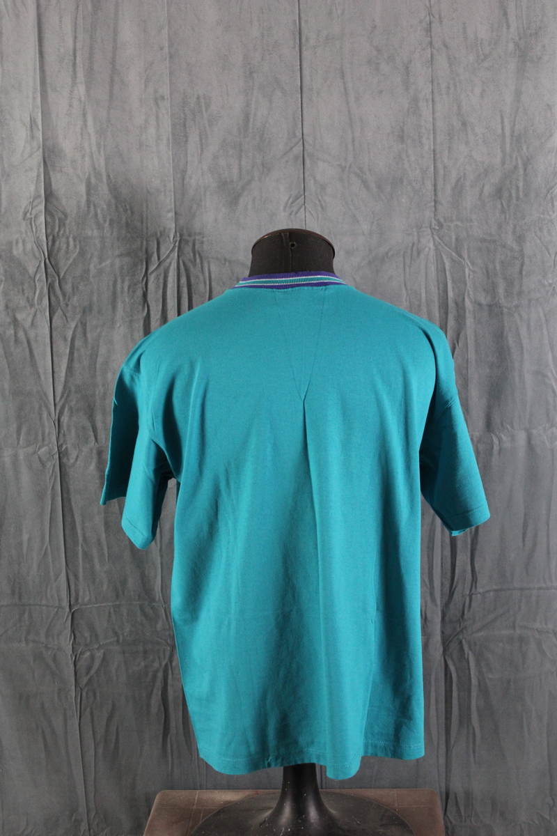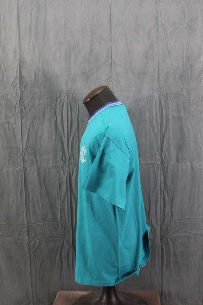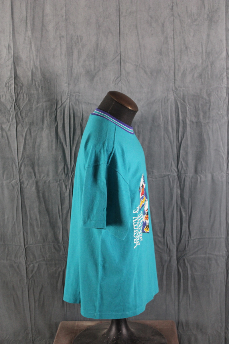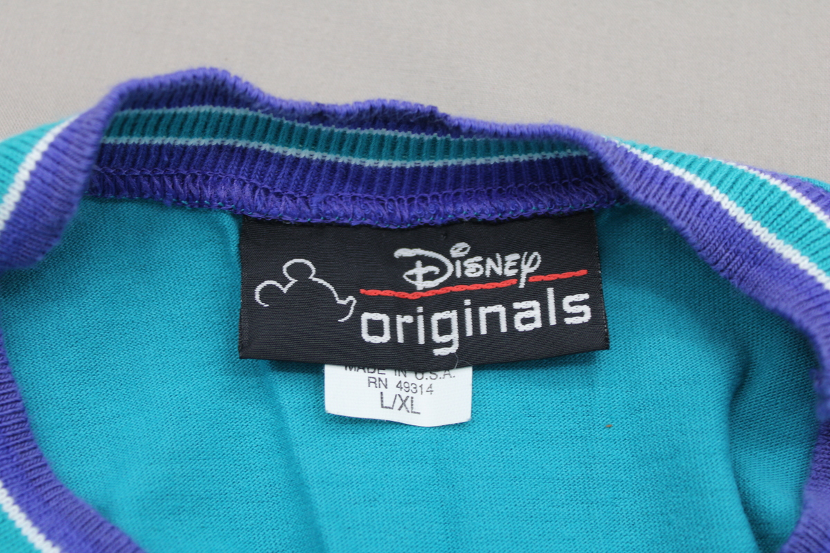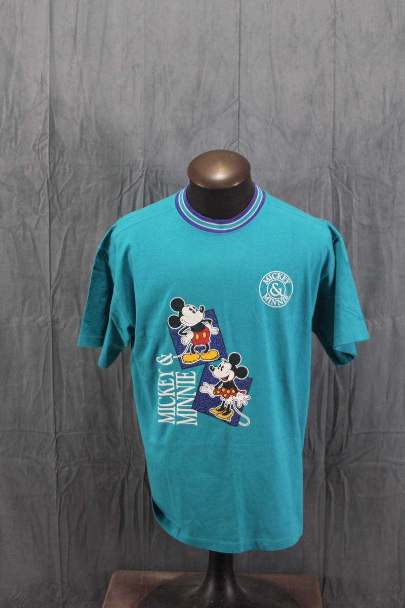 Up for sale is a vintage Disney shirt. It has a blue base colour with purple and white trim. The front of the shirt has a graphic of Mickey and Minnie screened on the chest. What a great shirt do not miss out on it.