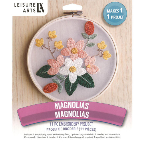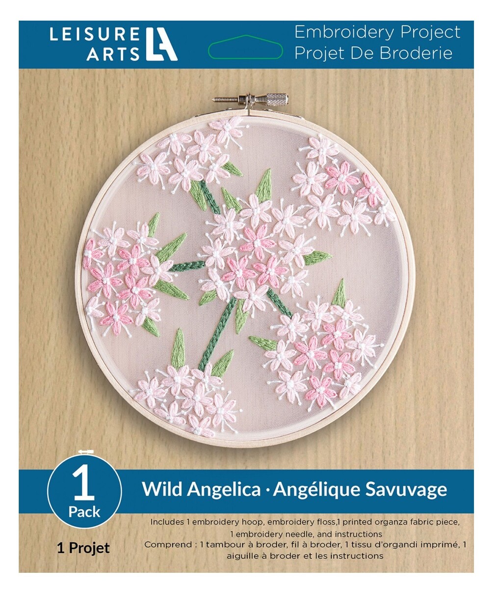 Leisure Arts Wild Angelica 6 Inch Embroidery Kit 56810. Leisure Arts 6 inch Wild Angelica embroidery project. Printed embroidery design features pretty pink angelica flowers stitched on organza fabric. Kit Includes: One 6 Inch Wooden Embroidery Hoop, Embroidery Floss, One Printed Organza Fabric Piece, an Embroidery Needle, and Step-by-Step Instructions. CHK-LAK56810