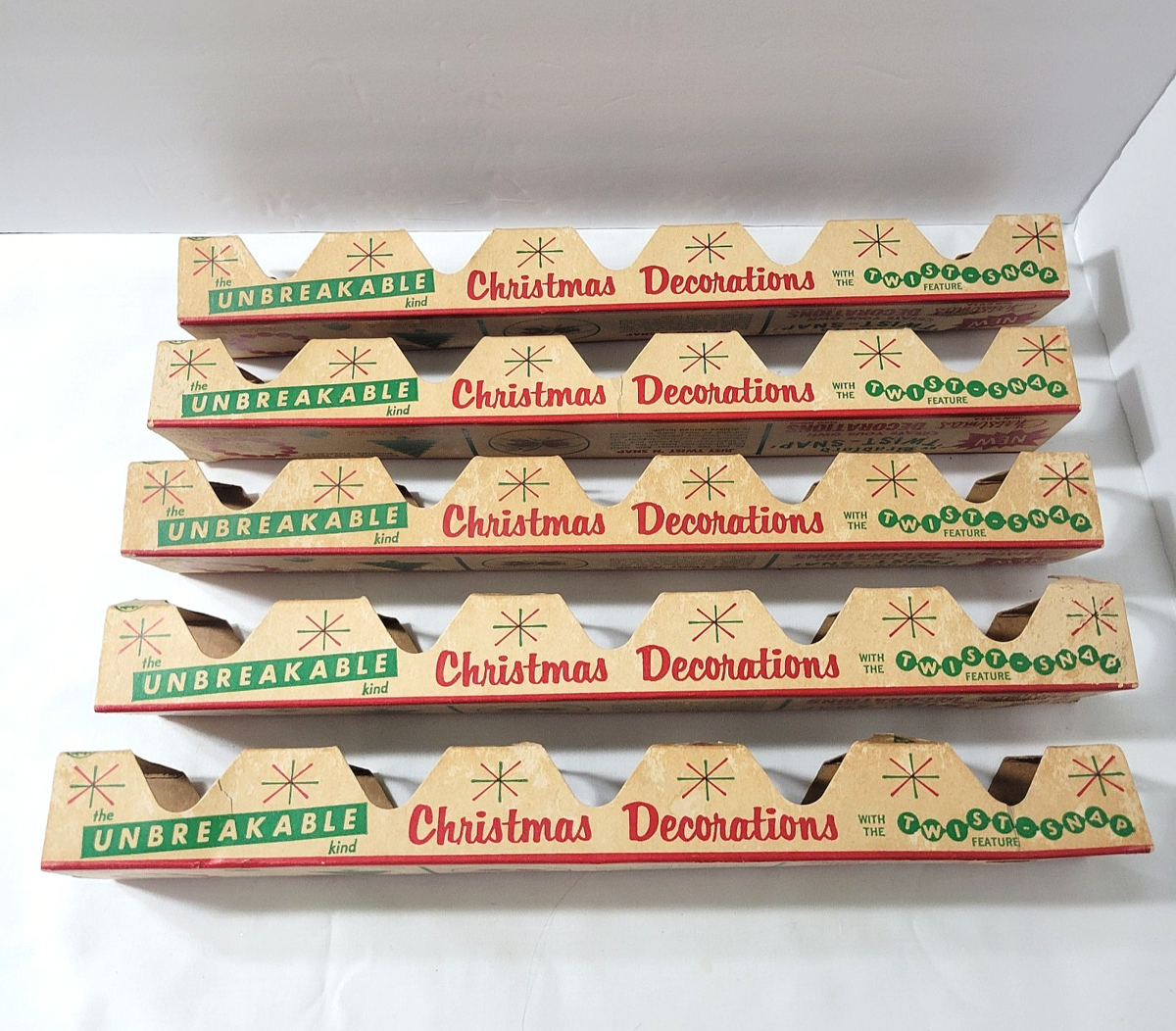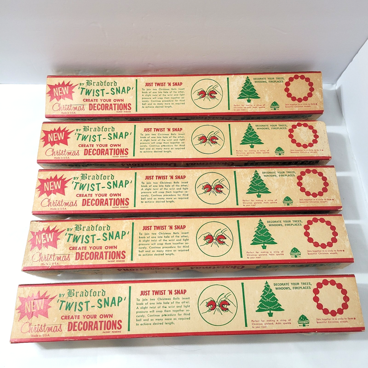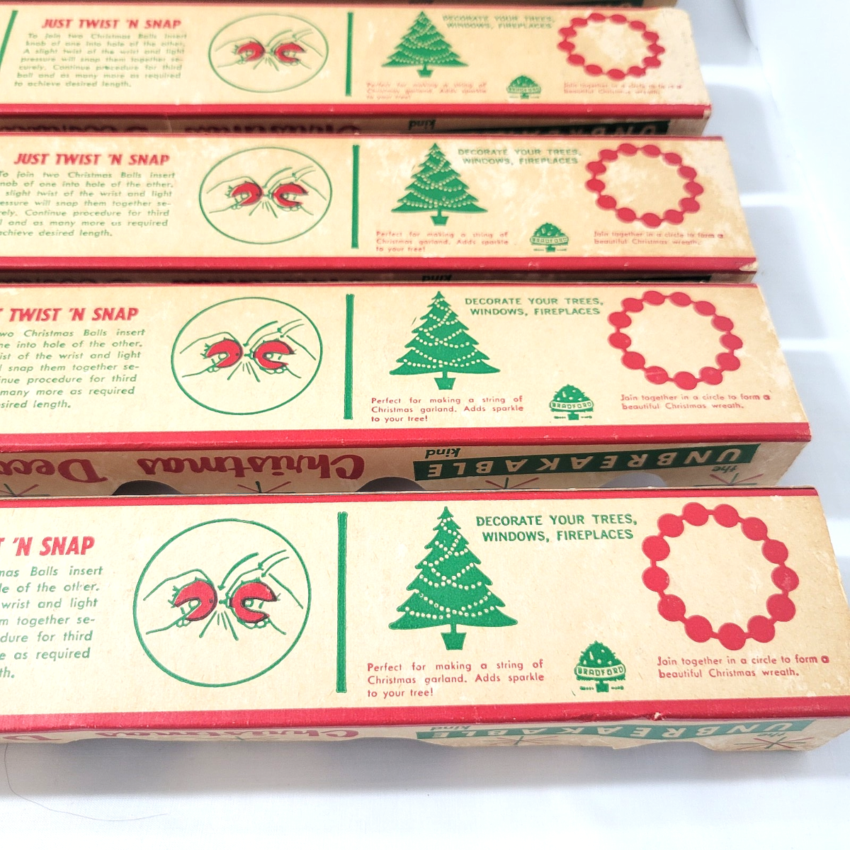 In original boxes, these are hard plastic smooth finish ball ornaments that can also snap together to form a garland or wreath