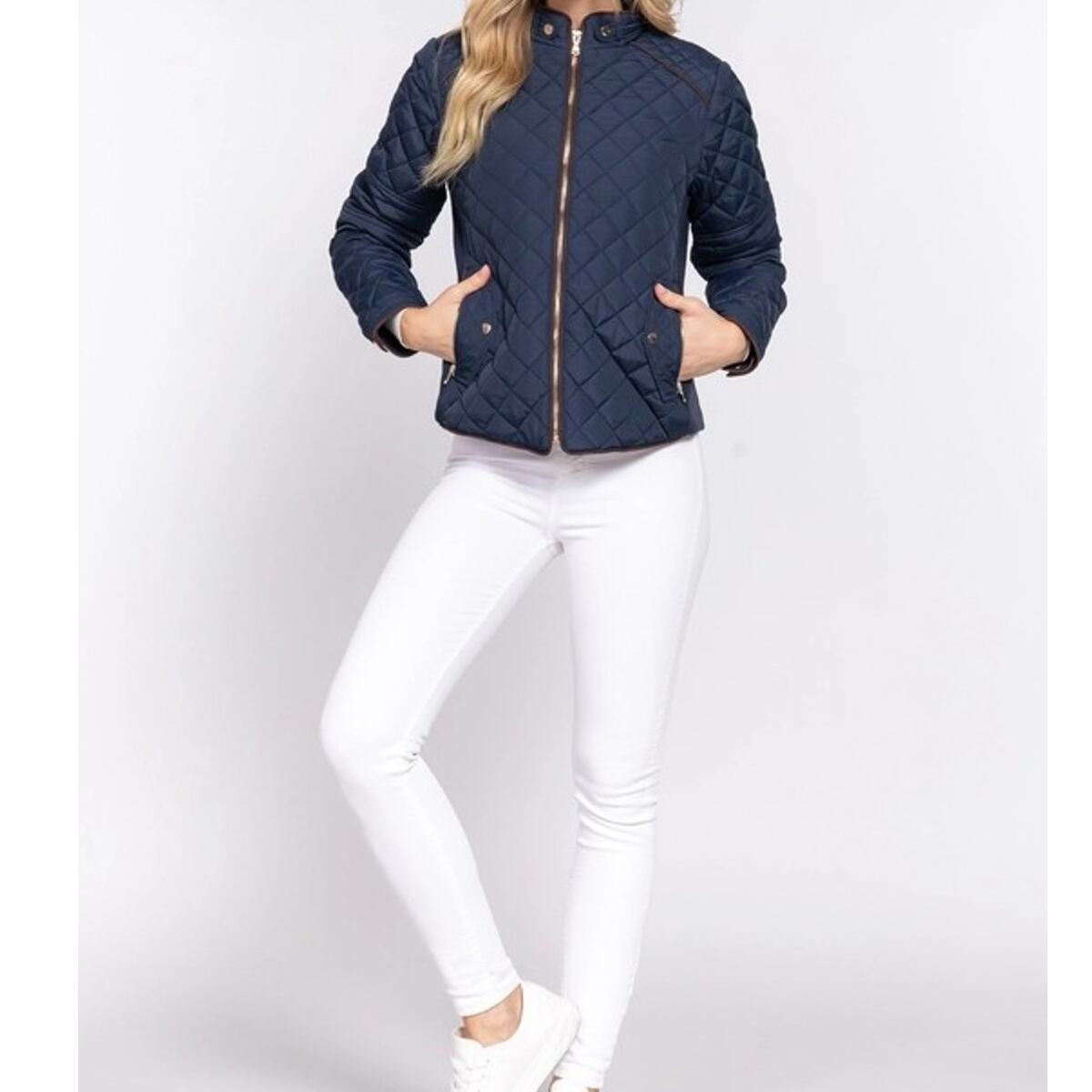Suede Piping Detail Knit Rib Quilted Padding Jacket Navy Blue Small