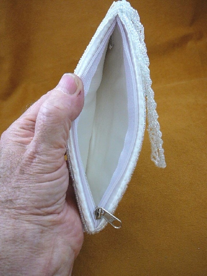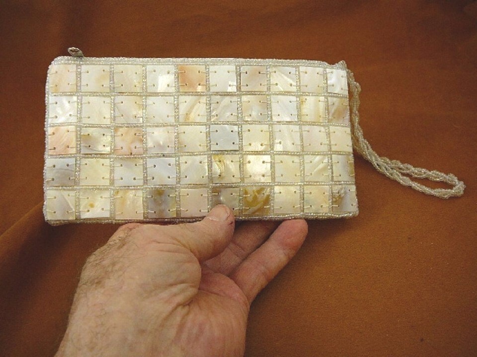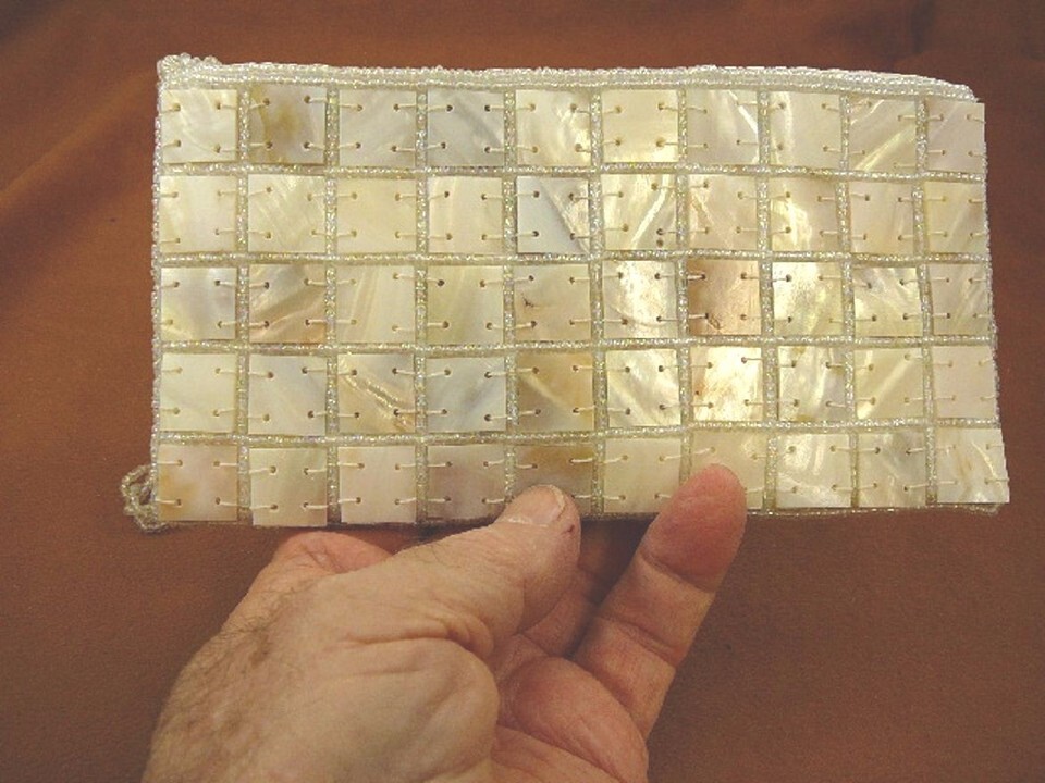 White 3/4? x 3/4? squares of genuine mother of pearl shell, sewn together on an ivory color satin material, lightly padded; edged in clear iridescent beads, ivory satin lined, no compartments.