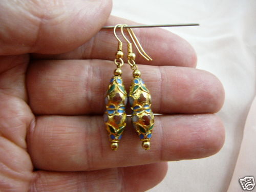 CLOISONNE EARRINGS, CHINA: Here's how a cloisonne bead is made: A copper body is hammered and welded. Then wire "cells" (where the word "cloisonne" came from) are formed and soldered on the copper body. Preliminary enamel filling and firing is completed (numerous colors of enamels are used in a single bead). Then 3 or more thin layers of enameling are filled and fired (never a heavy layer since it will bubble up and burn). Grinding off of excess enamel is done, then preliminary polishing, then final polishing. Finally, 24 k gold electroplating is done to complete the gilding of the cloisonne bead, which adheres to all the brass wired "cells" to make a beautiful work of art in each bead!