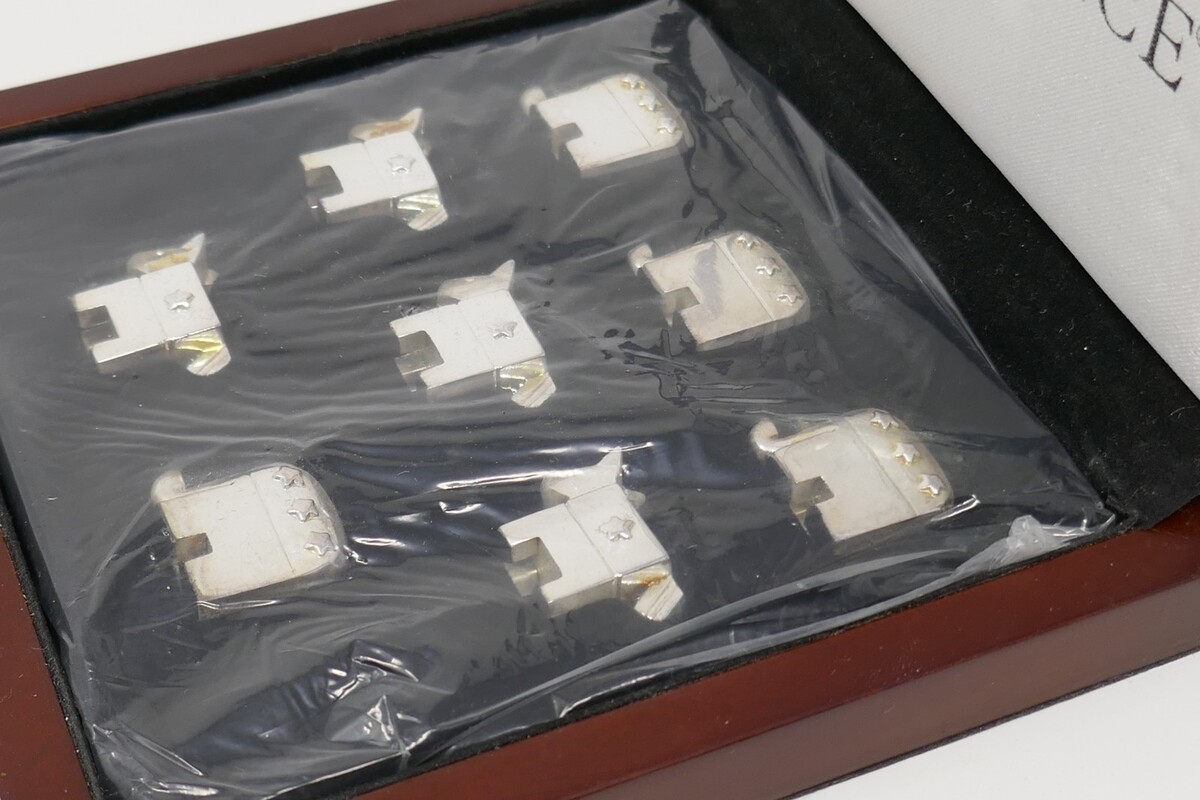 The Wallace Silversmiths Party Animals Tic Tac Toe Set is a game that reflects the theme of partisan politics within the United States. This includes 4 Democrat Donkeys and 4 Republican Elephants Silverplated pieces that are still sealed in plastic. Comes in a wooden hinges mirrored board that measures approx. 5.5" x 5.5" with minimal wear. Does NOT come with a box.