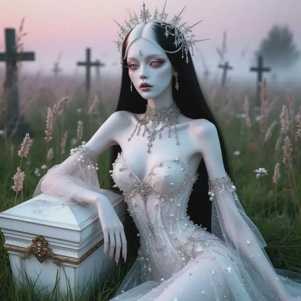 Brigitte is a pale, ethereal beauty frozen in time—forever adorned in her flowing white gown, faded lace whispering like ghosts in the breeze. Her dark hair tumbles down in soft, mournful waves, and her eyes carry the echo of vows never fulfilled. Found often near her grave, she lingers between worlds—neither angry nor vengeful, but heartbreakingly present.