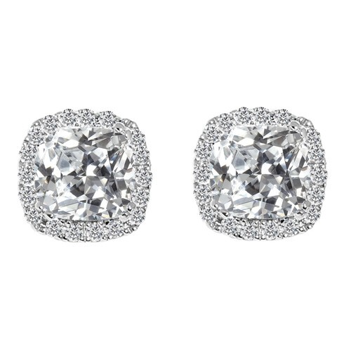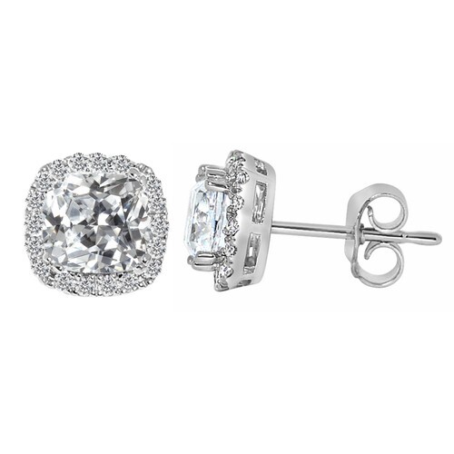 The earrings feature two cushion-cut, prong-set cubic zirconia, each measuring approximately 5.32 mm by 5.24 mm. Additionally, the halo is adorned with 36 round-cut, pave-set cubic zirconia, each measuring 1 mm, enhancing the overall brilliance and sparkle of the piece.