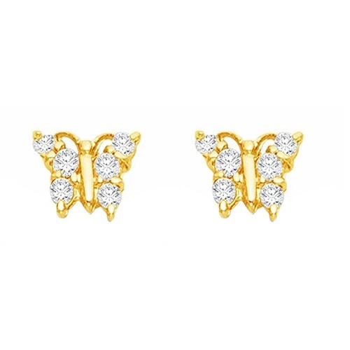 These stunning butterfly stud earrings are crafted from polished 14k yellow gold, showcasing a refined elegance. Each earring features six round brilliant AAA cubic zirconia, prong set to create an eye-catching and unique appearance that is sure to attract attention. Designed with a delicate size in mind, the earrings measure 5 mm in length and 7 mm in width, making them a perfect accessory for both casual and formal occasions.