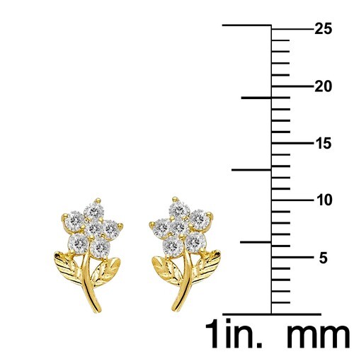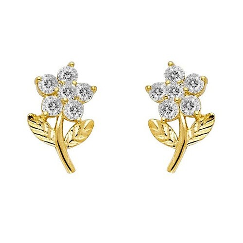 This exquisite pair of earrings features a stunning floral design complemented by a cluster of stones. Crafted from 14k yellow gold, these gold studs showcase six round brilliant AAA cubic zirconia stones, providing a brilliant shine and a touch of elegance. The elongated design enhances the polished gold finish, ensuring these earrings stand out in any jewelry collection.