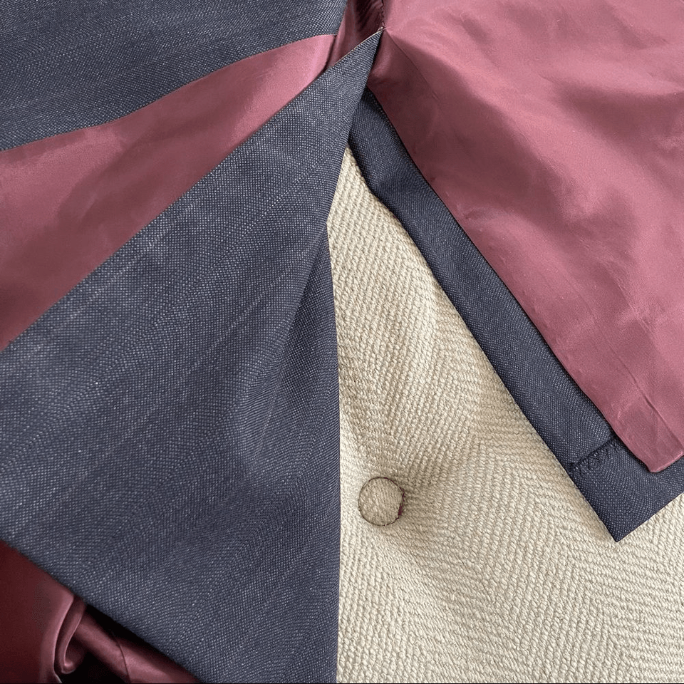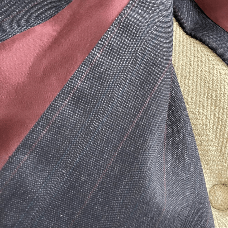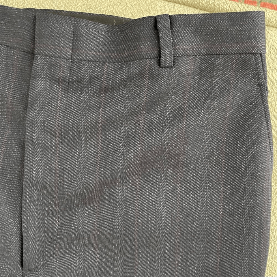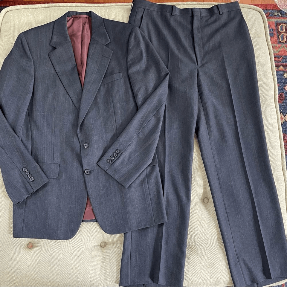 Vintage dark blue 100% wool union made hickey Freeman two-piece suit with two button closure on the jacket, flap hip pocket, one single chest pocket and interior pockets. Single back vent. The jacket is tag size 41 long and measures 32 inches from shoulder to ham, 20.5 inches from armpit to armpit and 26 inches from shoulder seam to cuff. The pants are flat front with a talon zipper, 2 hip pocket, one change pocket, and back welt pockets (one buttons). Laying flat they measure 17? across the waist and a 31? inseam with 3? in the hem. The suit itself is dark blue with a faint red and blue stripe throughout.