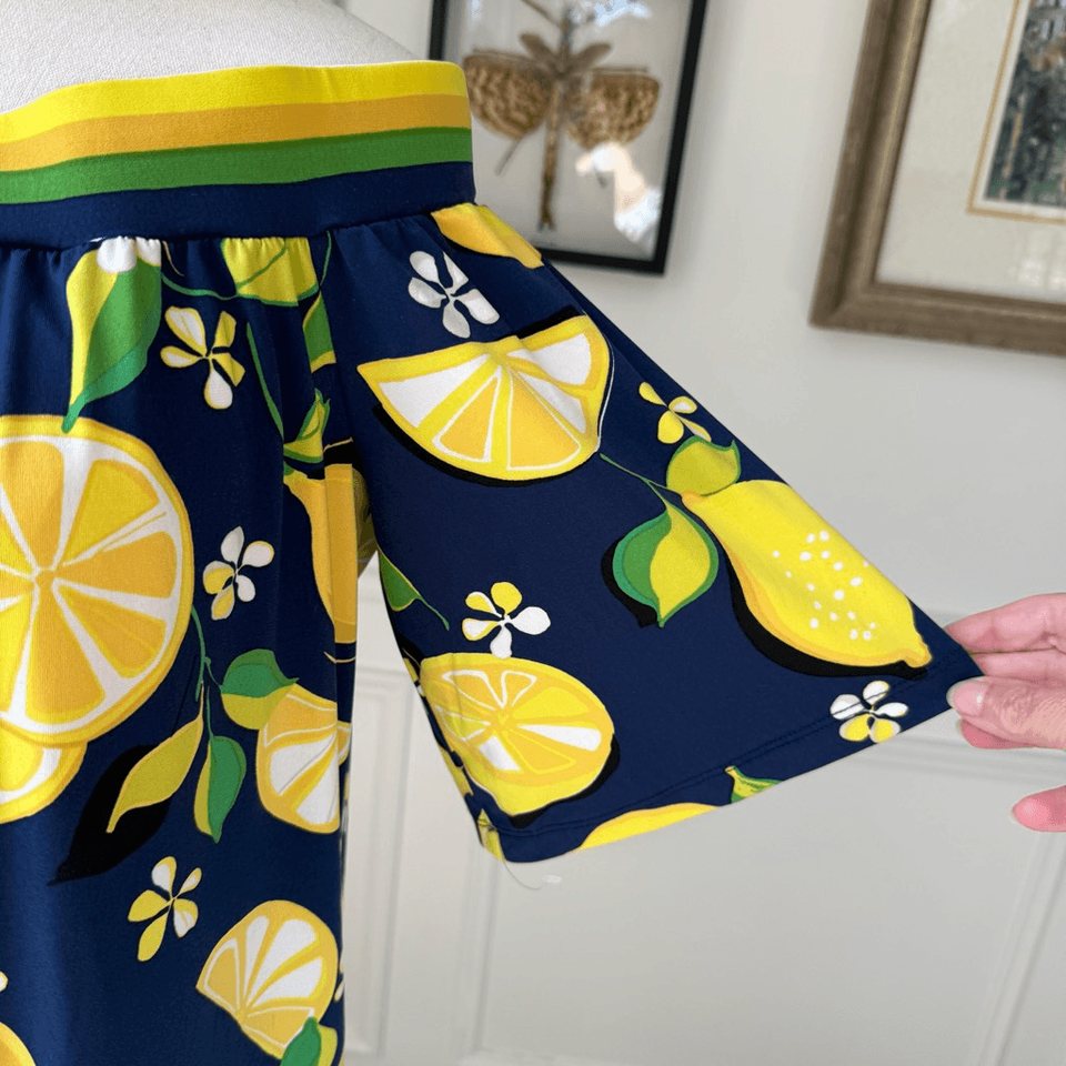 Trina Turk Kelso Lemon Print Off The Shoulder Dress Blue Yellow M