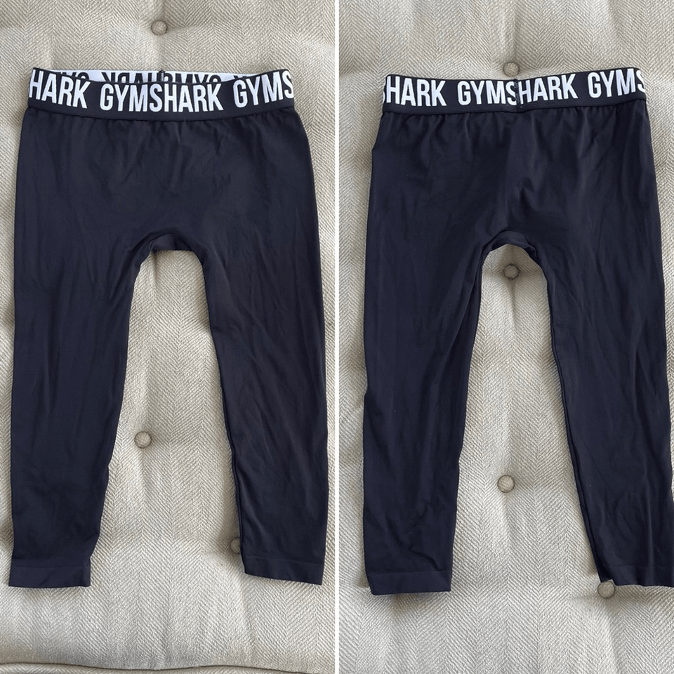 Gymshark seamless cropped leggings with logo waist band. Laying flat measures 13 inches straight across the waist with an 8.5 inch rise and 18.5 inch inseam. Nylon and elastane blend.
