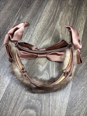 The Vintage Mink and Satin Halo Hat for women exudes timeless elegance with its brown mink fur and luxurious satin material. Made in the United States, this original vintage piece adds a touch of sophistication to any outfit. Perfect for those looking to make a statement with their accessory, this hat is a unique and special addition to any wardrobe.