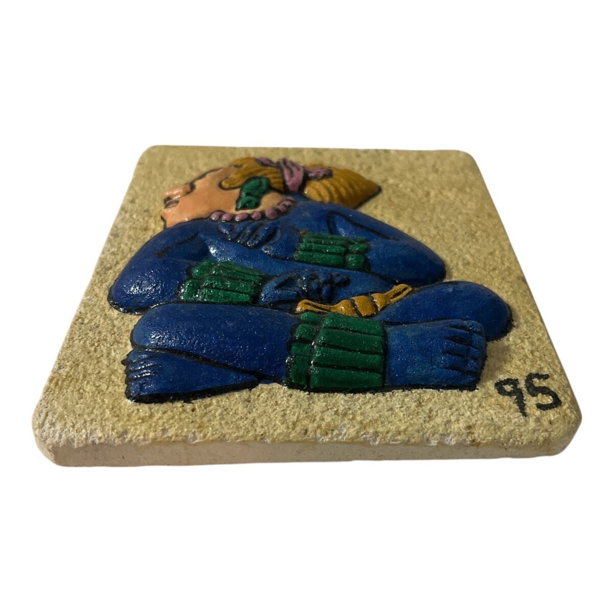 The small ?95? visible on the front is not part of the ancient Mayan design. It indicates the production year (1995), commonly added by the artisan or workshop to mark when the replica was made.