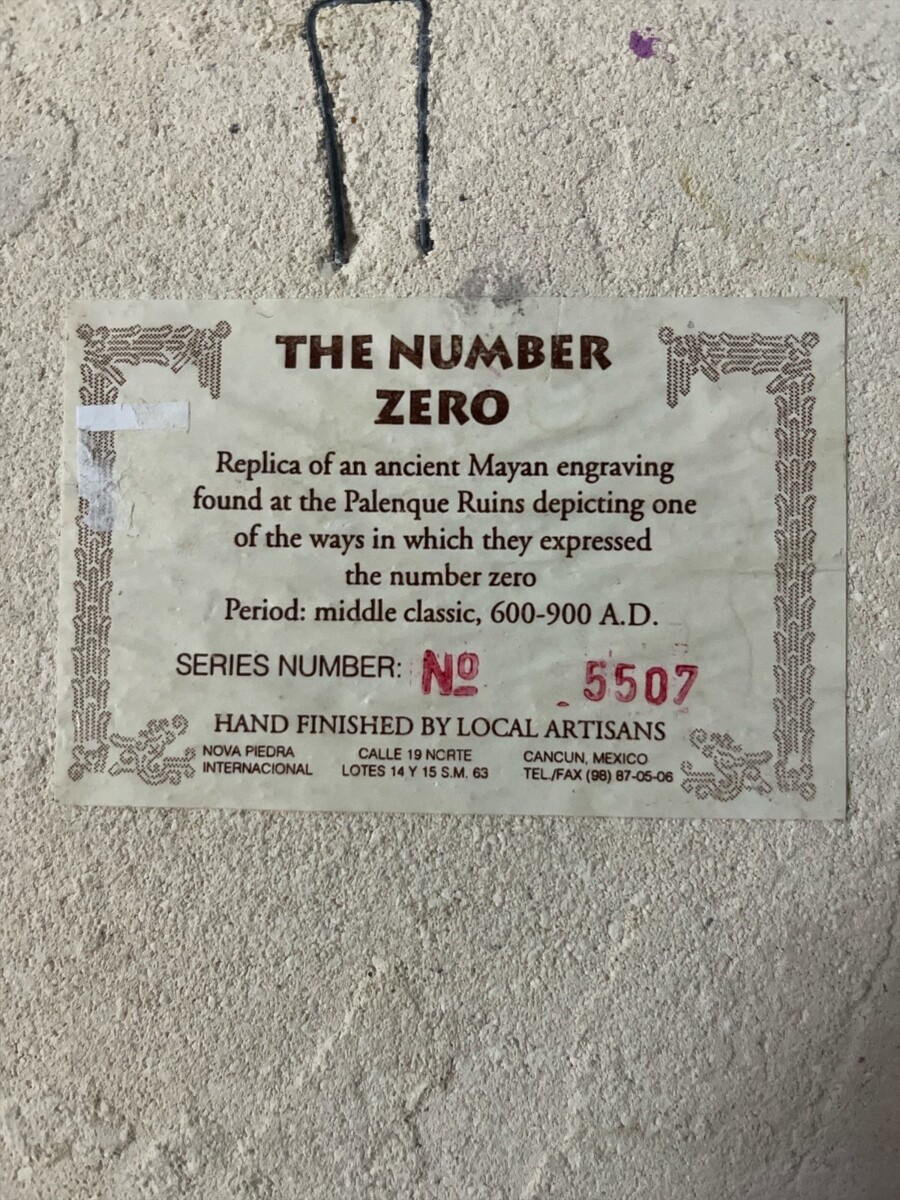 Vintage decorative wall plaque featuring a raised relief replica of an ancient Mayan engraving depicting the number zero, inspired by carvings found at the Palenque ruins. This piece is hand finished by local artisans in Mexico and includes the original descriptive label on the back explaining its historical and cultural context.