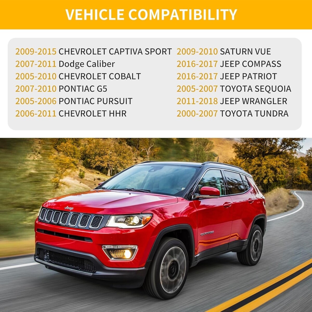 HHR 2006-2011, Jeep Compass 2016-2017, Jeep Patriot 2016-2017, Jeep Wrangler 2011-2018, Pontiac G5 2007-2010, Pontiac Pursuit 2005-2006, Saturn Vue 2009-2010, Toyota Sequoia 2005-2007, Toyota Tundra: 2000-2007.