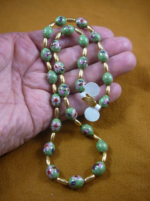 (Internal #V-246-14) You are bidding on a beautiful, handmade, Medium green cloisonne, with 10x4 mm gold plated rice beads. Necklace is 20" long, 9x12 oval cloisonne beads, with gold safety closure.