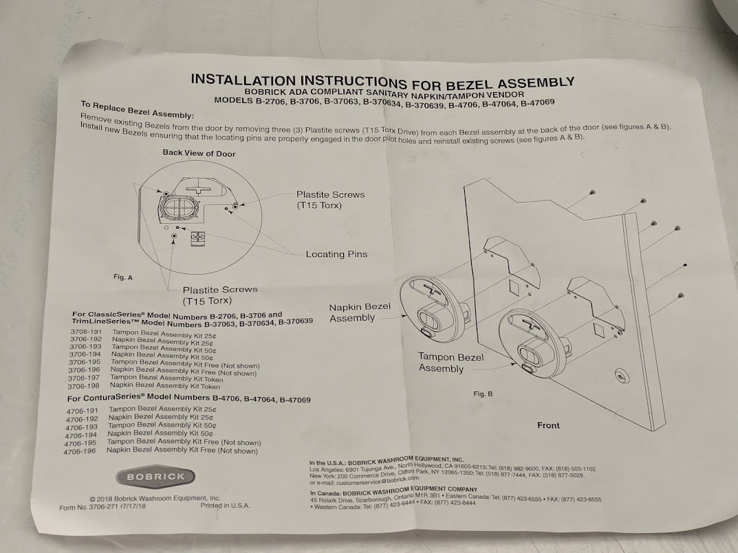 FOR PARTS-Bezel, Hardware, Manual-Bobrick Napkin and Tampon Dispenser B-2706C