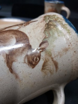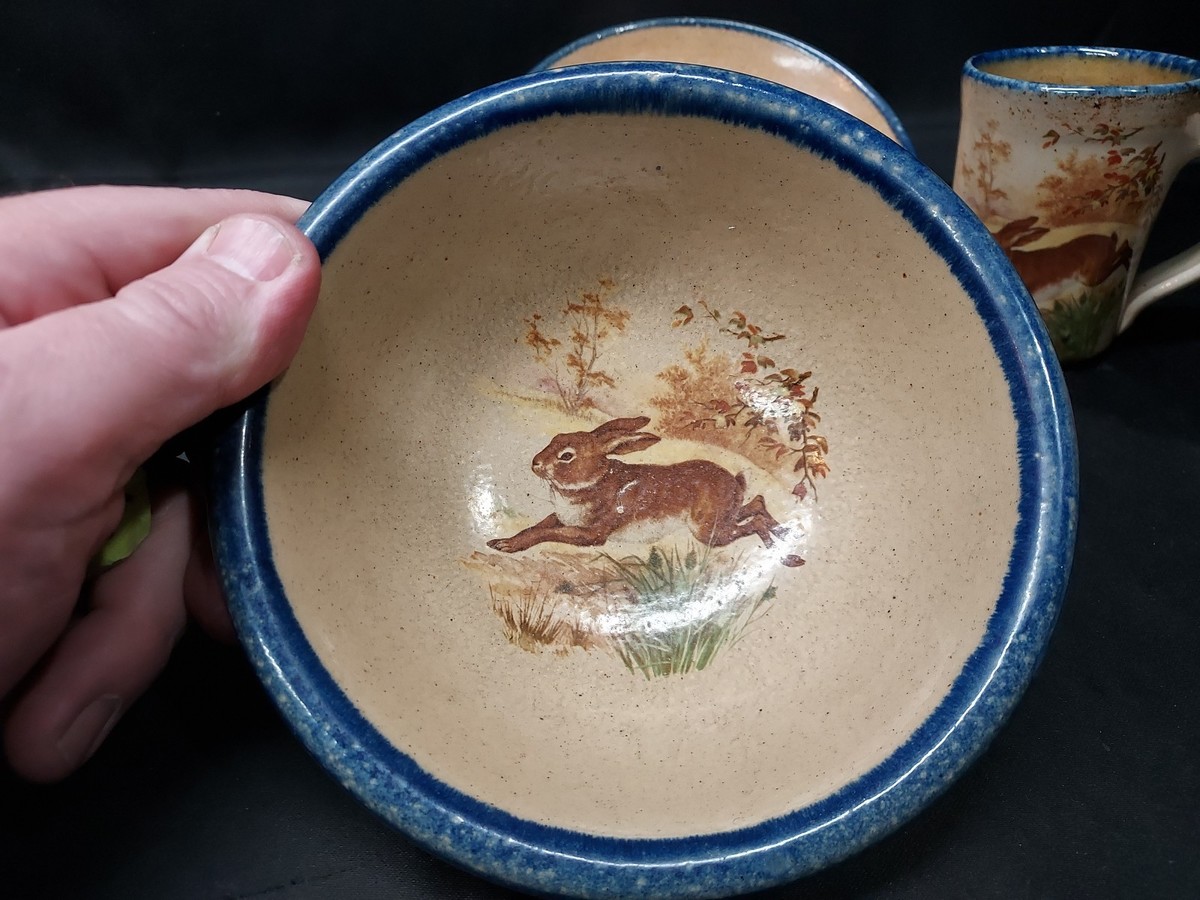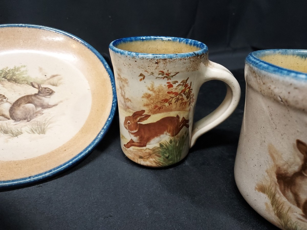 Vintage Monroe Salt Works Maine Pottery Bunny Rabbit Bowl Plate Mugs Lot Of 4