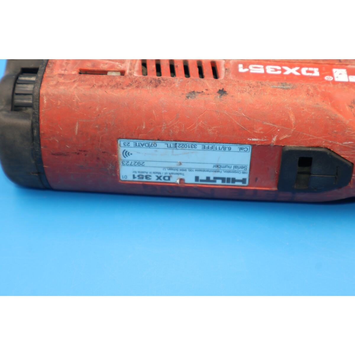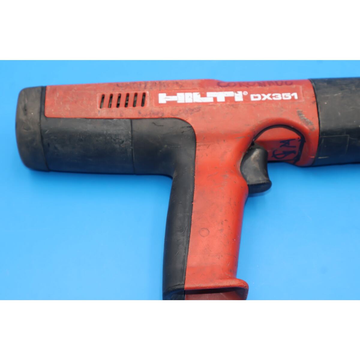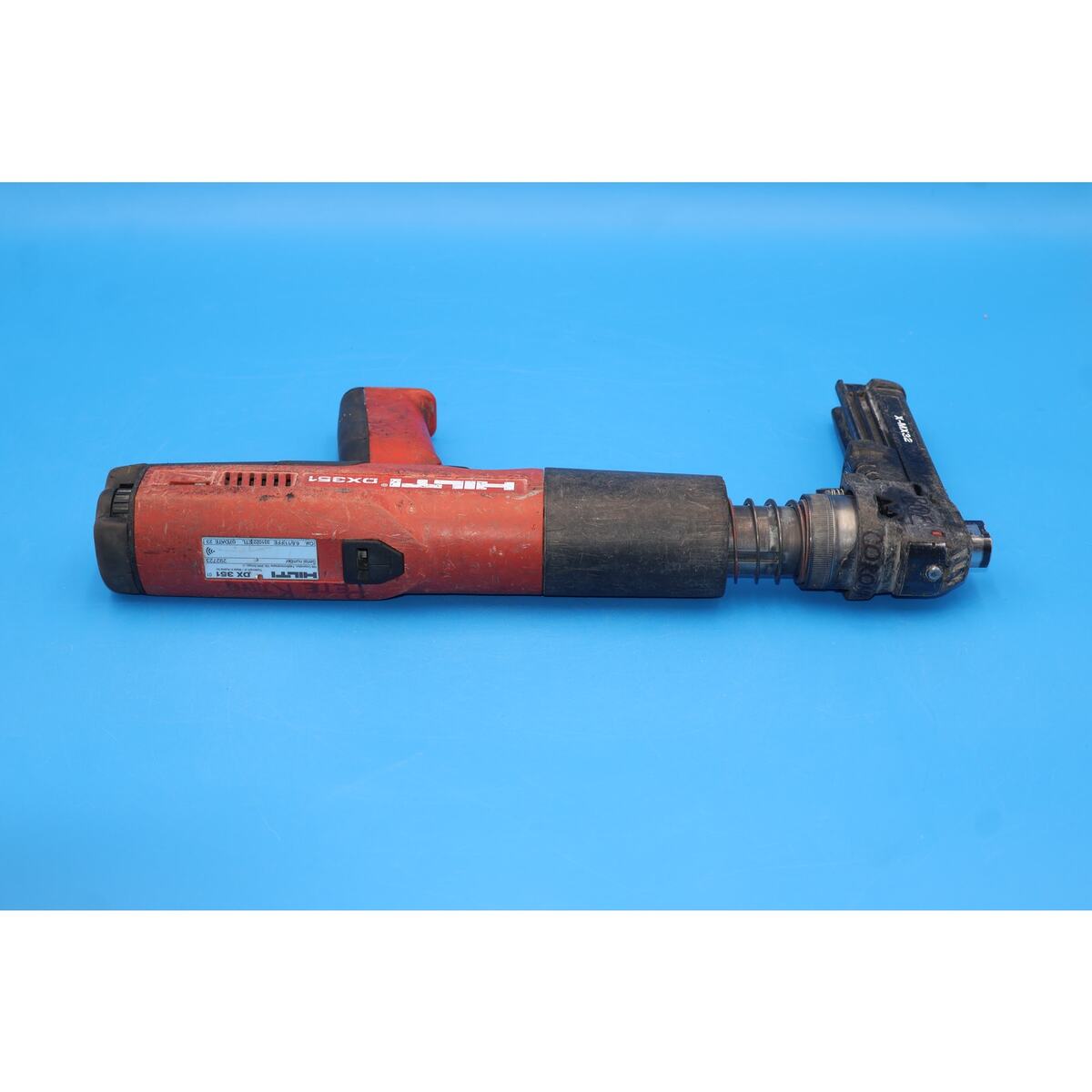 You are looking at a Hilti DX351 Powder Actuated Fastening Tool with X-MX32 Magazine. It is used and in fair condition, showing signs of normal use including scuffs, scratches, grime, and previous owner markings throughout the tool. The most noticeable blemishes are cosmetic only and do not affect functionality.